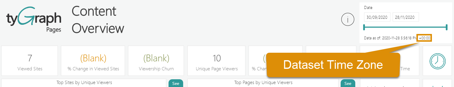 You can customize the report time zone for the tyGraph Pages product. This is a setting that is applied for the dataset and thereby any reports pointed to it.