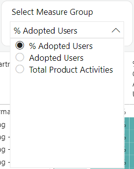 - Microsoft 365 Adoption Overview This filter contains groups of calculations which are projected onto the attached visualizations - the matrix and line graph. This is a powerful new development, when combined with the user attributes slicer, allowing for the user to custom configure the matrix with their desired data view. There are 39 different configurations to explore. Each calculation group represents five underlying key adoption metrics, for example the 'Adopted Users' selection option will display the following metrics in the matrix (as new columns) and the line chart (as new lines): Email - User Activities, OneDrive - User Activities, SharePoint - User Activities, Teams - Activity, and Yammer - User Activity. While the user attributes slicer will change toe rows in the matrix to data points such as city, job title, etc. Try toggling back and forth between adopted users and percentage of adopted users for a data exploration treat. Want to see which departments are low on Microsoft Teams adoption? Configure the matrix by user attribute "department" and then calculation group "User adoption". Curious about what percentage of the users that represents? Change the calculation group slicer to % of Adopted Users. This feature was in experimental development mode and can be implemented into many other pages and areas of this report in future releases, but because of how exciting it was it was rolled out immediately but the only on the opening page. Look for more in future versions!