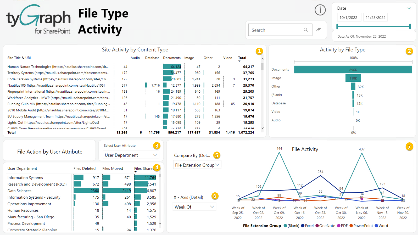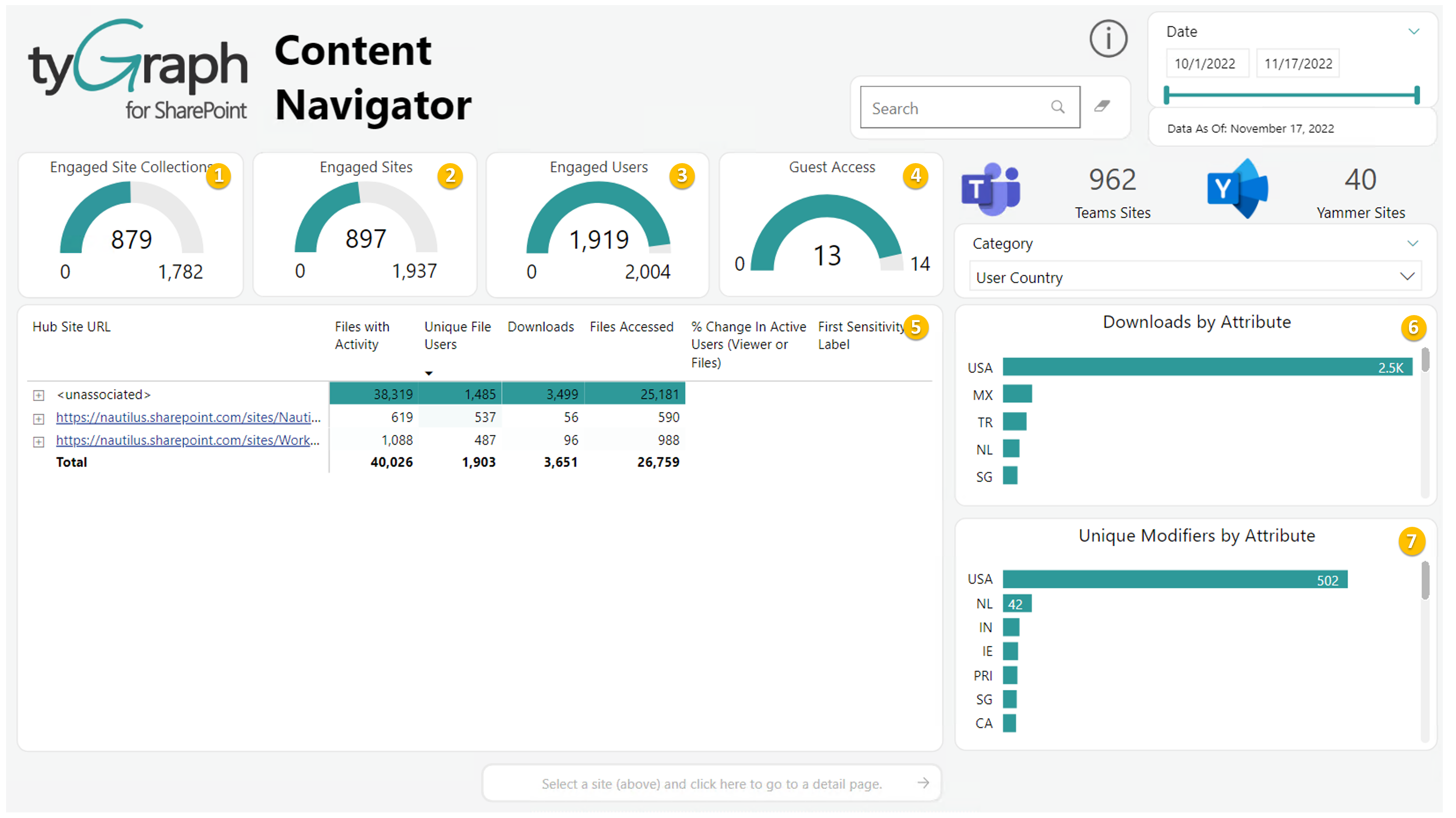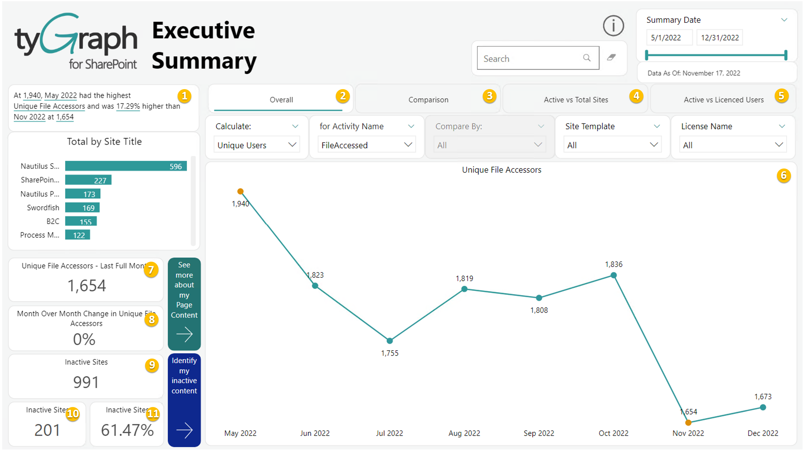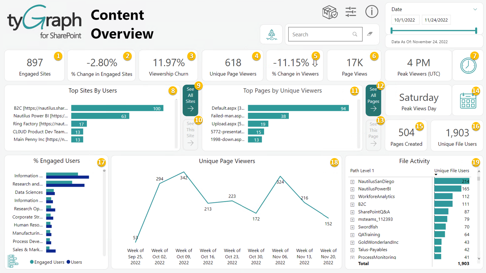- Content Overview Page - SharePoint Site File Activity Hierarchy by Unique File Users Totals:A matrix style visualization that allows one to sort SharePoint sites by the most unique file users and using the plus symbols for each site drill down into the underlying file and site hierarchies that exist.