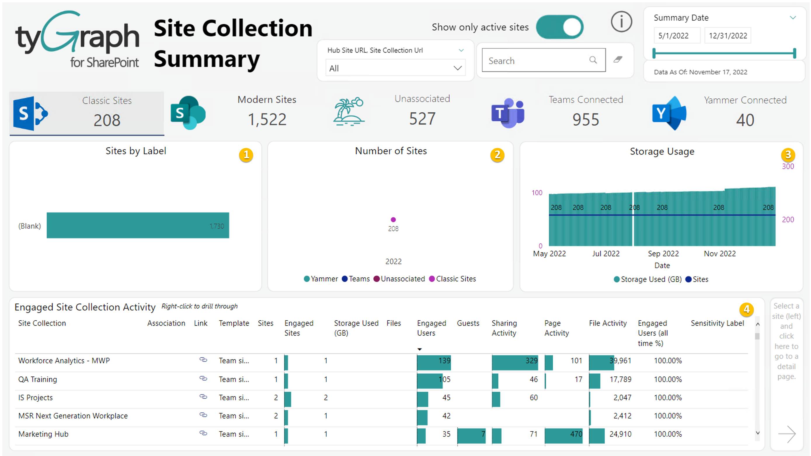 - Drill into your most active site collections. Teams and Yammer icons identify respective connected sites. If you right click on any row you can drill through to the site collection detail page.