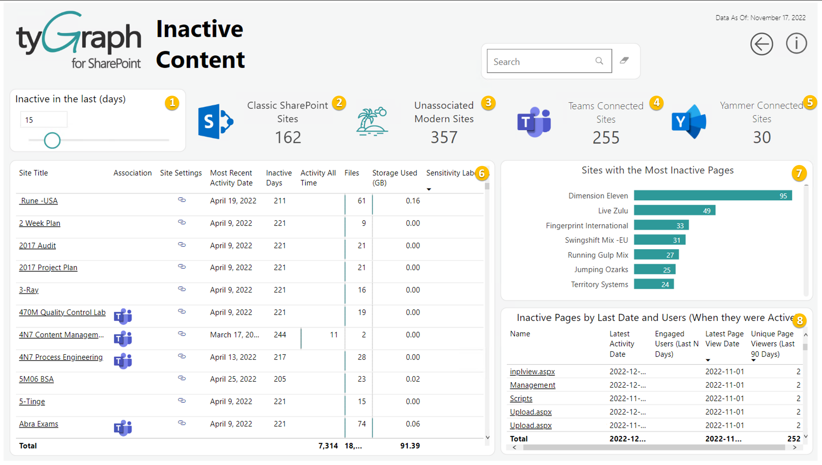 - Shows inactive pages based on the last date they were viewed, and who viewed them.