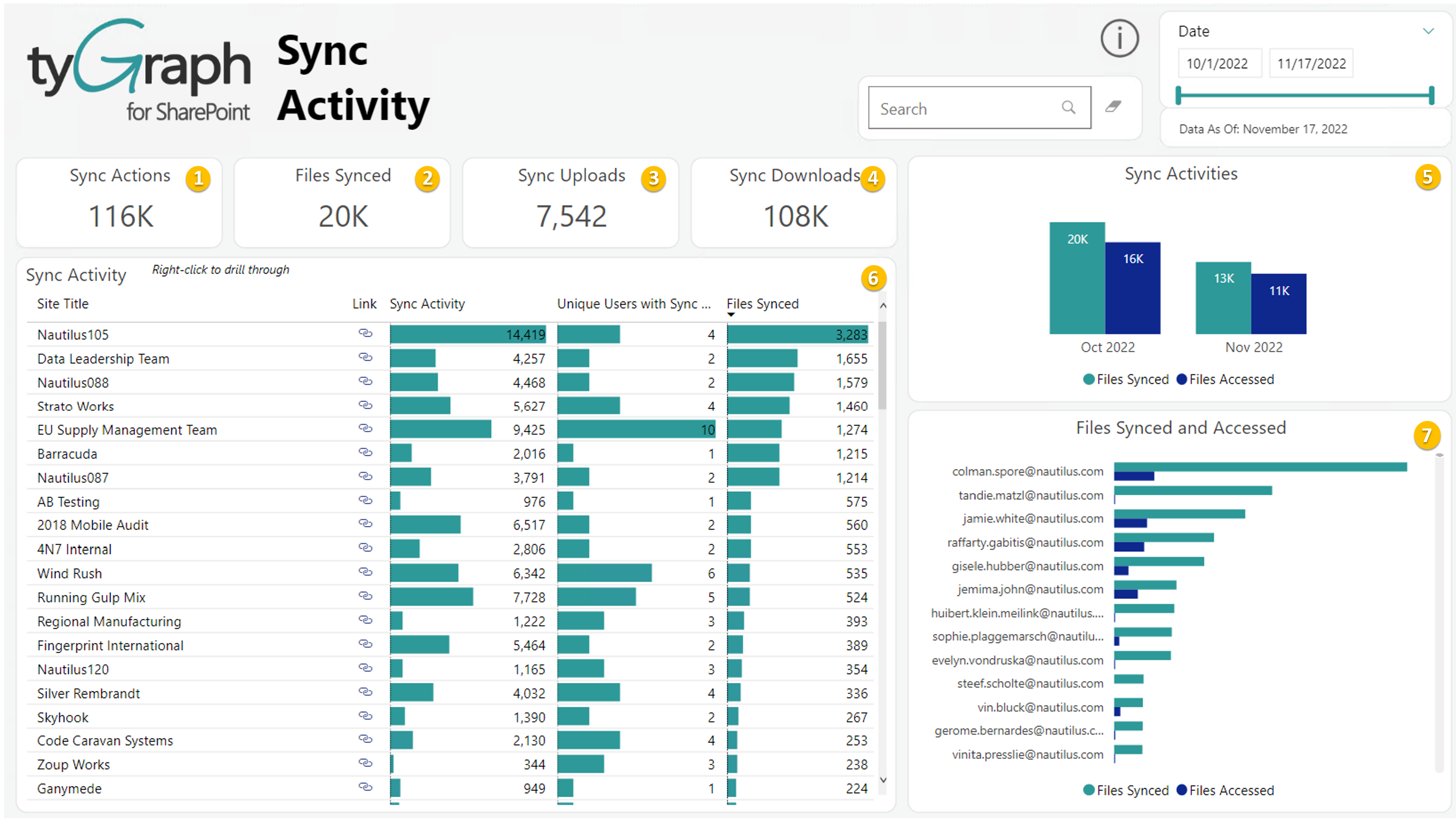 - Total files with sync activity against them. Sync activities include: FileSyncDownloadedFull, FileSyncDownloadedPartial, FileSyncUploadedFull.