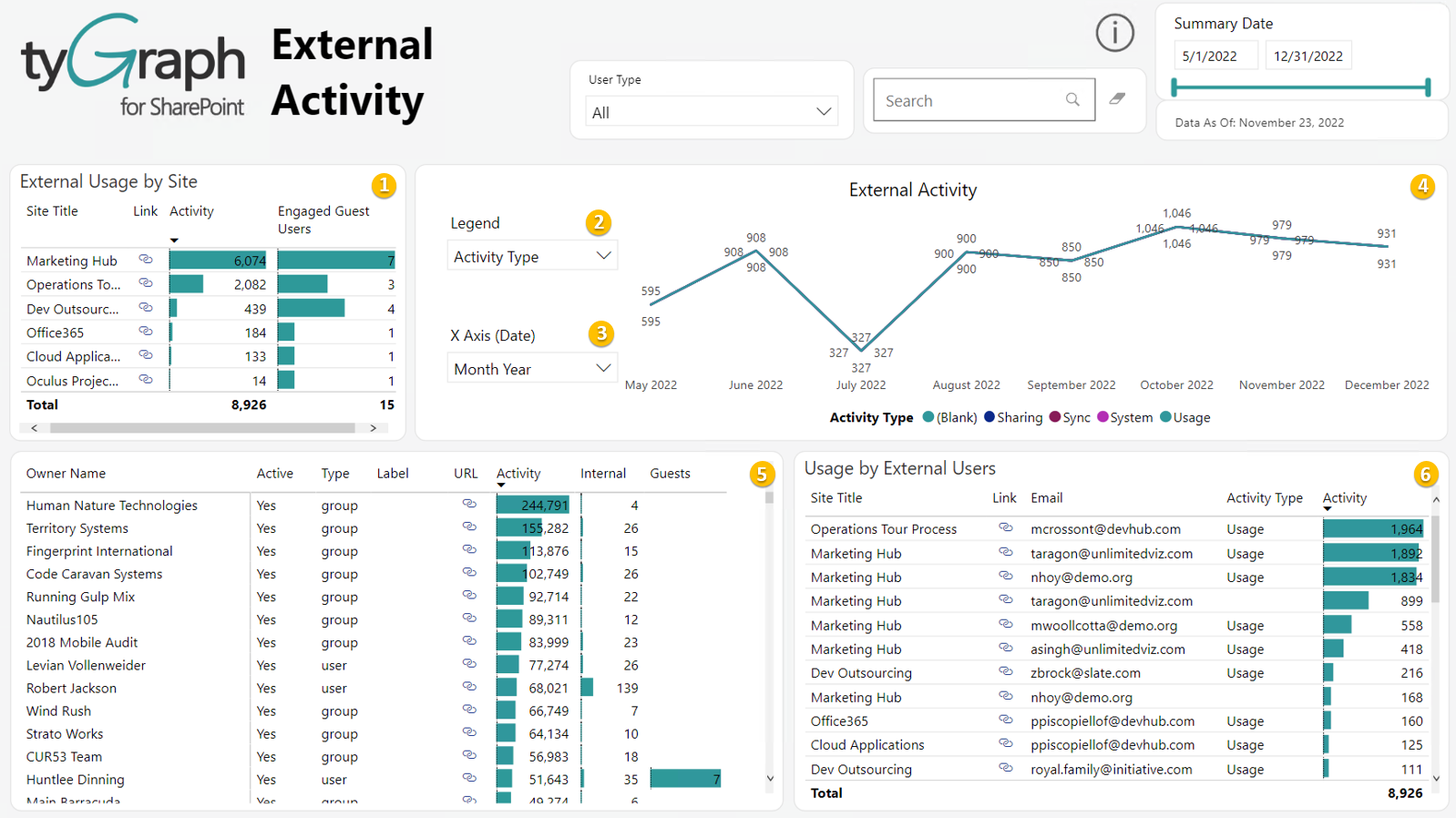 - All activities for external users by date. For details how external users are defined, see the help tip on the title of this page.