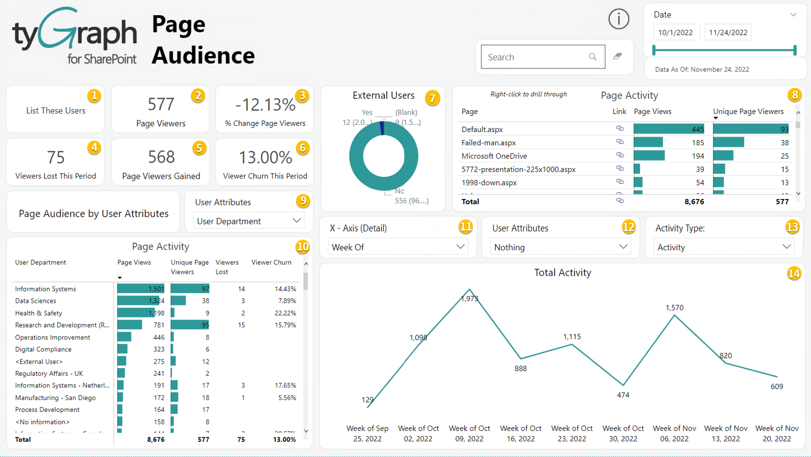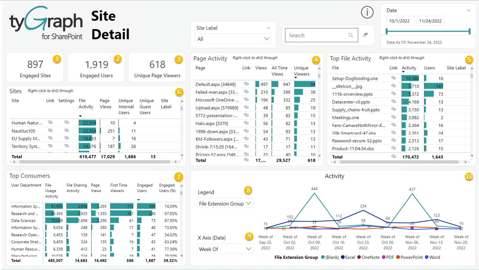 tyGraph for SharePoint provides detailed analytics into the sites, pages, and files that make up your intranet. Value is added by providing HR and organizational information to the data with additional context provided through geography and time scale data points. This in turn helps transform simple data into information that can inform decision-making. SharePoint analytics are provided at the tenant level for a strategic view of the data that can be drilled down into, the site (tactical level) and finally to the file/page level for an operational view of the data within your intranets. tyGraph for SharePoint is where you understand collaboration and track the performance of your organization's investments in SharePoint. This is a summary of all visual help tips in the latest tyGraph for SharePoint report. All tooltip items are brief descriptions of the visual and calculation, limited to 250 characters. You can see the visual help tip appear by hovering over any visual card in Power BI. Bolded “Help – “ items indicate help tips that are backed by a tooltip page.