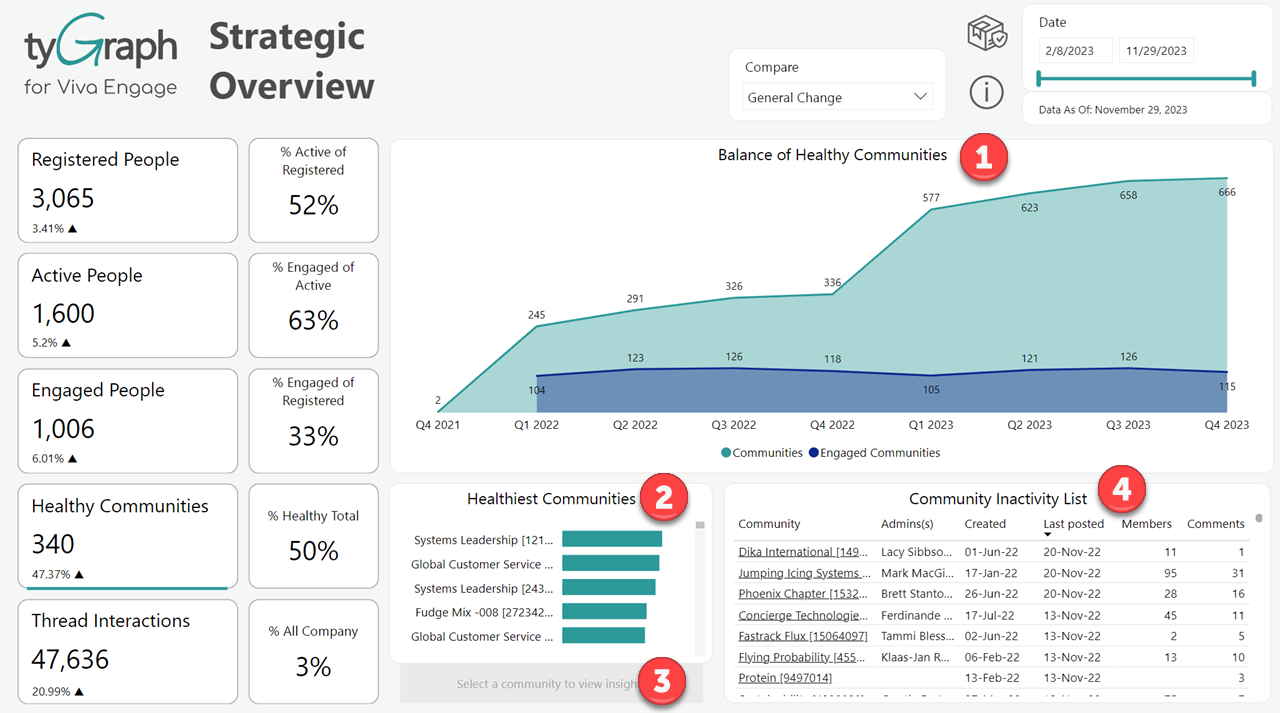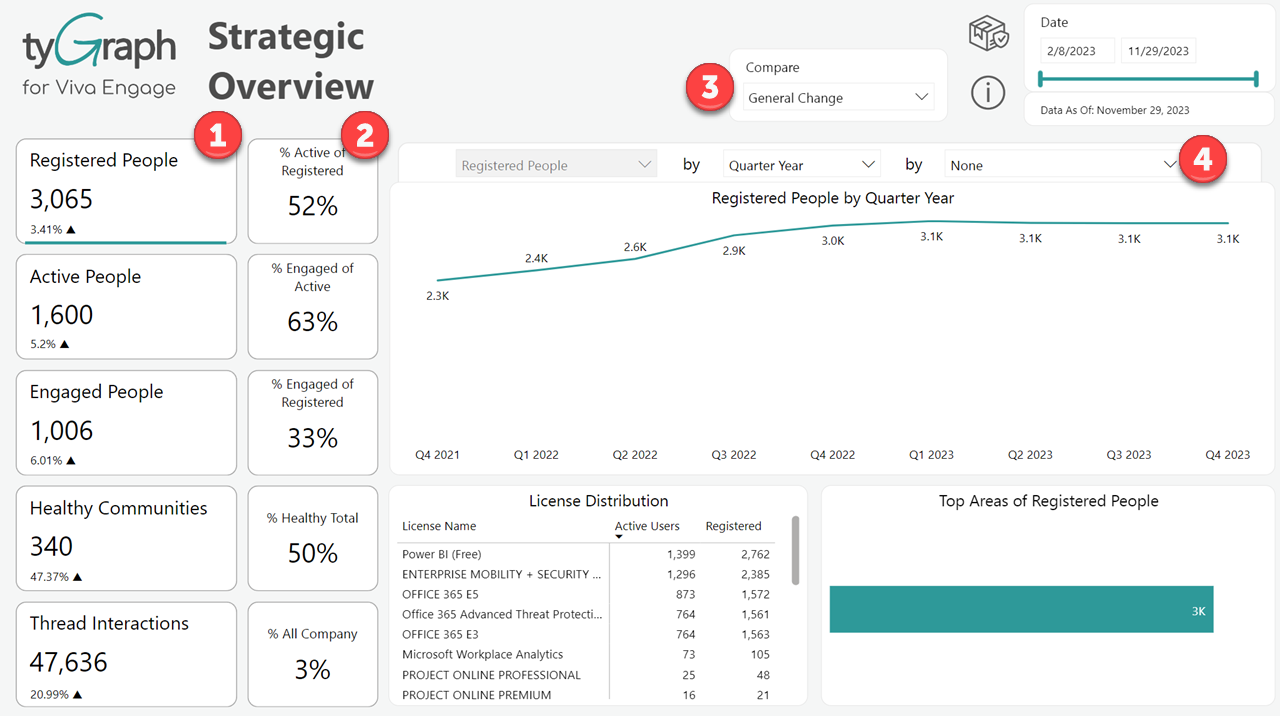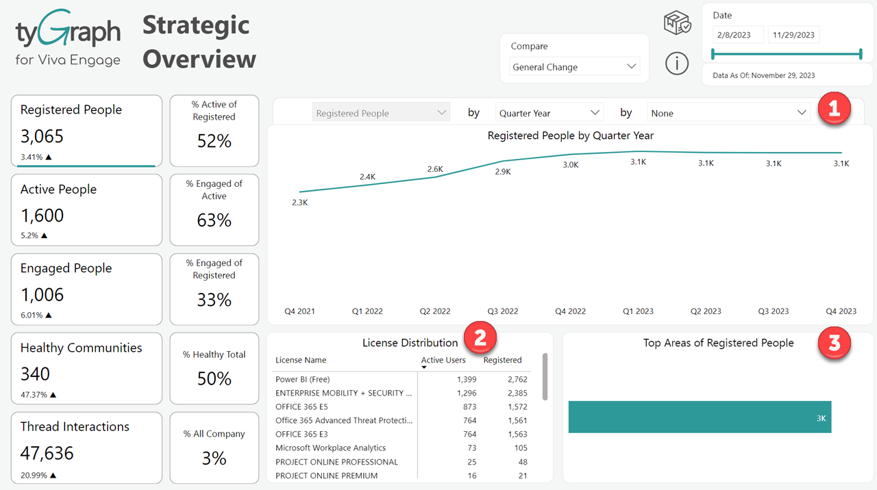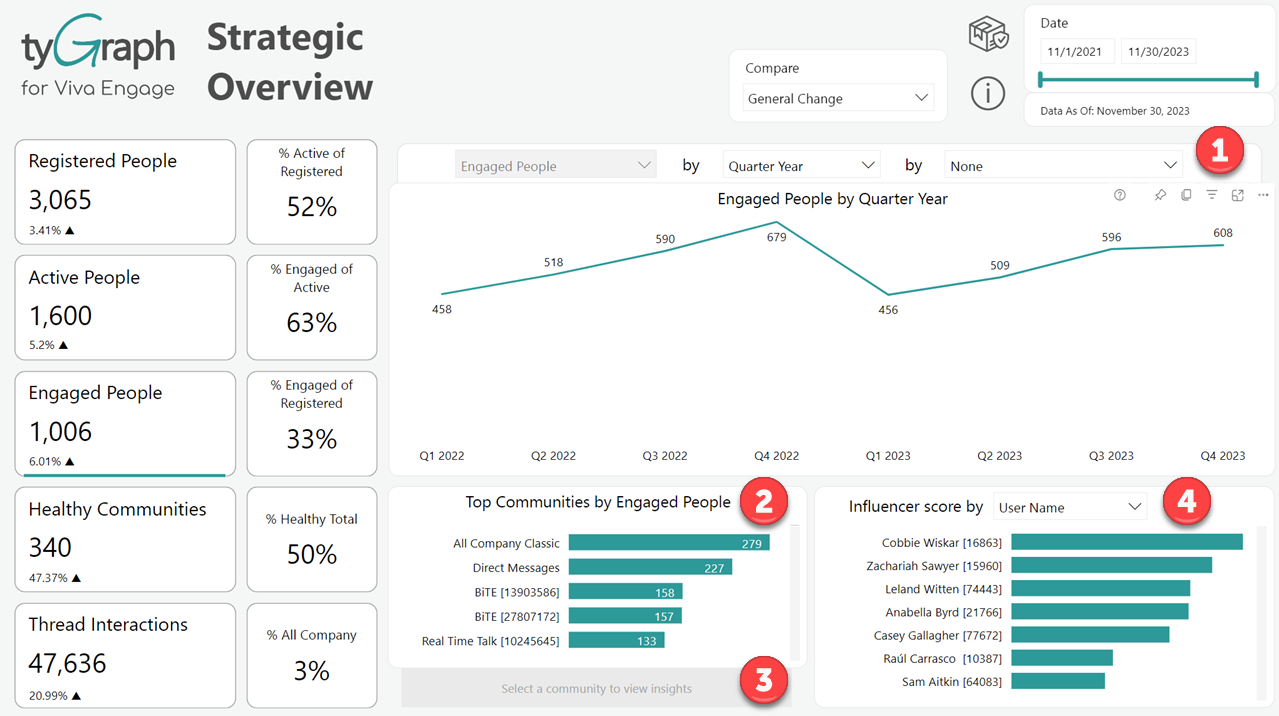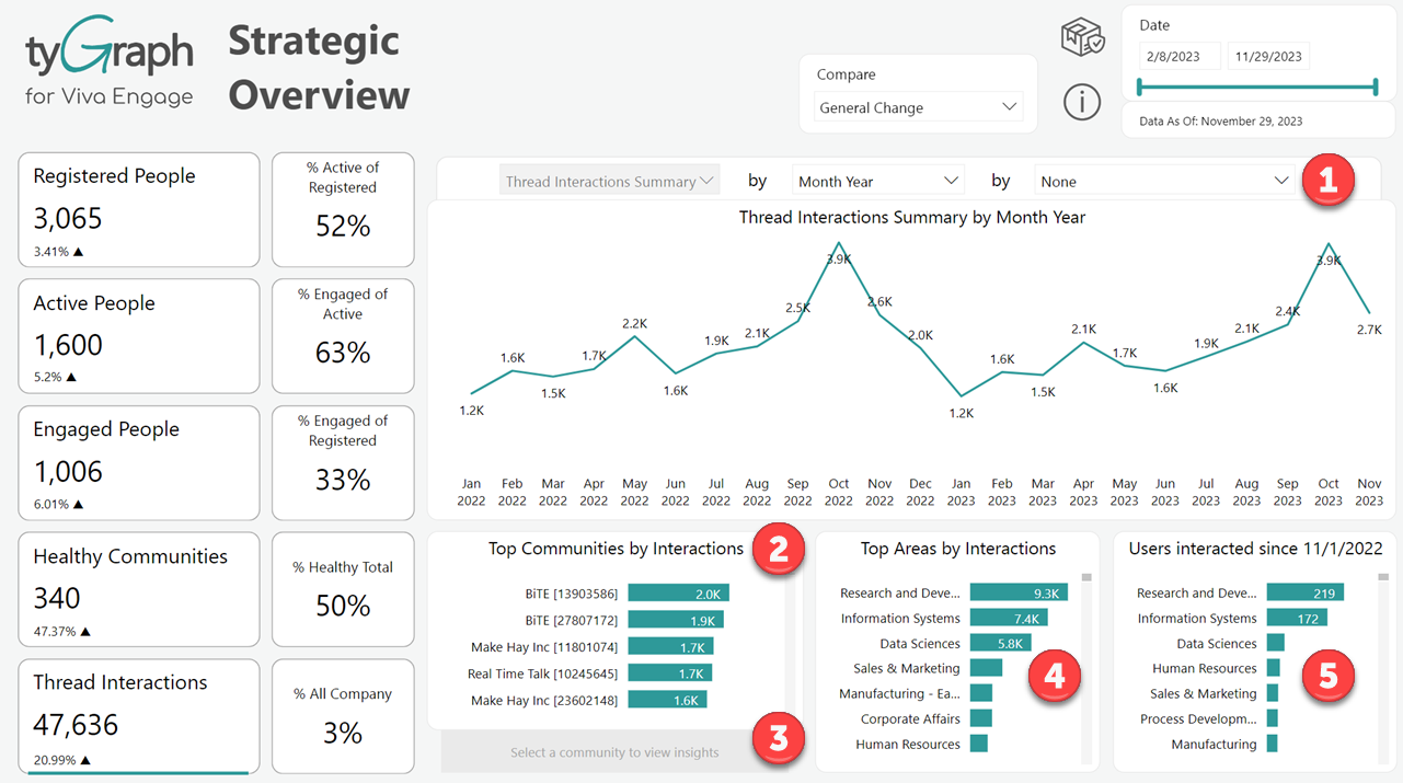 The interactive cards positioned on the left-hand side facilitate seamless navigation through diverse layouts, empowering you to delve into the nuanced aspects of your Viva Engage network. Explore insights on registered individuals, active participants, engaged contributors, thriving communities, and dynamic thread interactions, providing a comprehensive understanding of the overall engagement and vitality of your network.