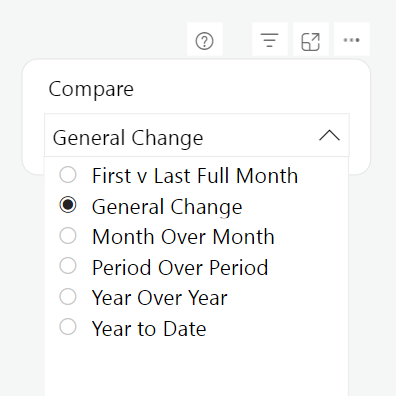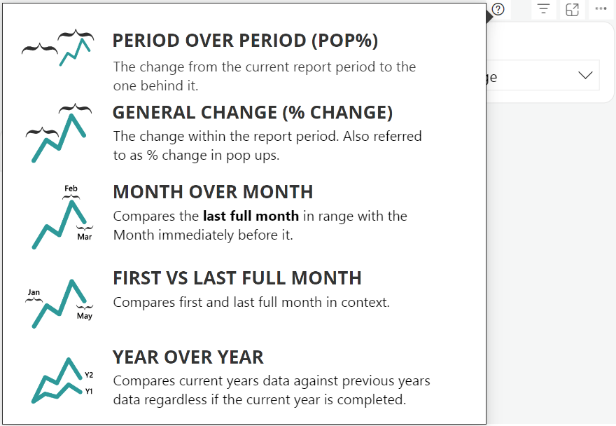 The time measure comparison dropdown allows you to alter the indicators within the left-hand navigation cards, enabling a comparison of trends across five predefined categories. The defined categories are outlined below for your reference.