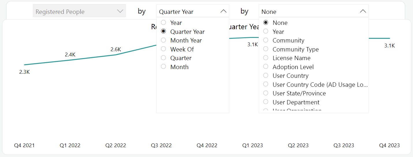 The versatile line chart, accessible in all layouts, provides you with the capability to select a dynamic x-axis and apply various slicers, including Community, Country, and Department. The synergy of these two drop-down menus has a significant impact on understanding adoption trends across different facets of the organization and over various timeframes. For example, selecting Month by Year reveals unique audience insights year over year for the specified period. This functionality aids in gauging the network's traction from one year to the next.