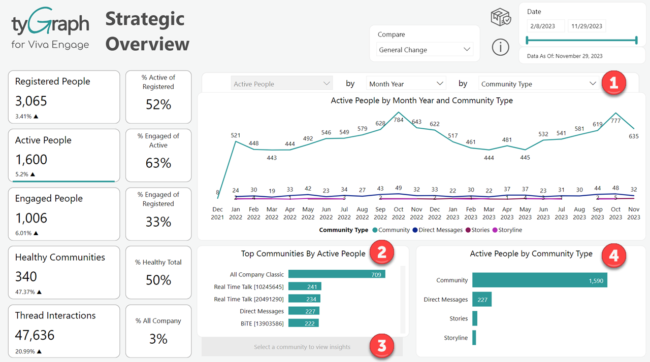 - The "Top Communities by Active People" visual highlights communities that have experienced the highest level of activity within the chosen time frame. By selecting a specific community, the entire report is cross-filtered to display activity exclusively related to that particular community.